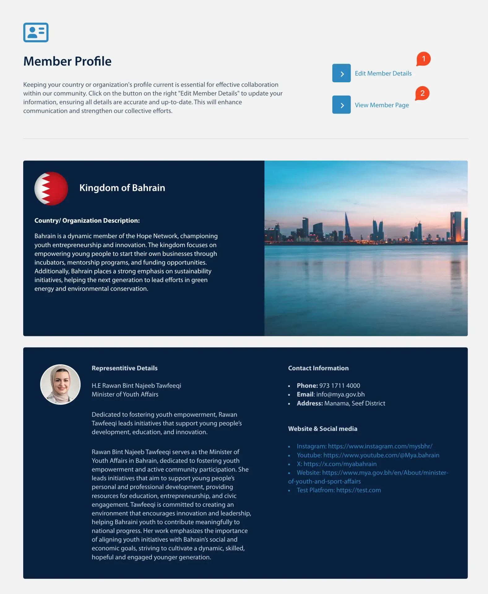 This section covers how to view and update your Member Profile details, including organizational or country-specific information and your representative details.